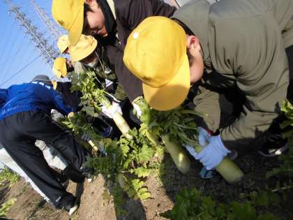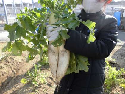 4年生が加賀屋子ども農園へダイコン掘りへ行きました。毎年11月の下旬なのですが、今年はダイコンの発育が悪く、時期が遅くなりました。加賀屋子ども農園でお世話してくださる地域の方々の努力のかいもあり、とても立派なダイコンになりました。ダイコンを手にした子どもたちは大喜びで歓声を上げていました。