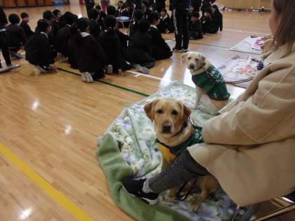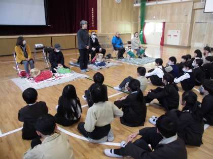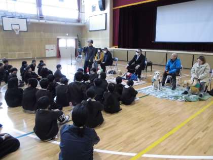 ふれあいを通して、盲導犬のことを知る体験をしました。目が見えないとはどういうことなのか、盲導犬はどんな働きをするのかなどを学びました。実際に盲導犬と生活を送っている方の話も聞くことができました。