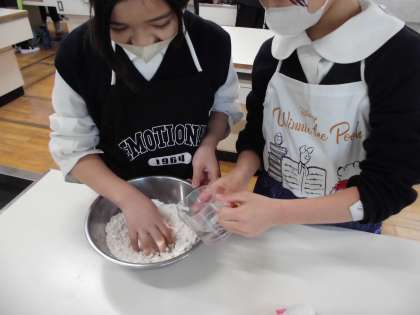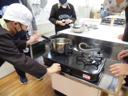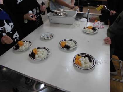 5年生が家庭科調理実習で「白玉団子」をつくりました。めあては「役割分担をしてみんなが楽しめる調理実習にしよう」です。「すごくおいしい!」「白玉ちょっとかたいなあ」仲良く声を掛け合って実習をしました。