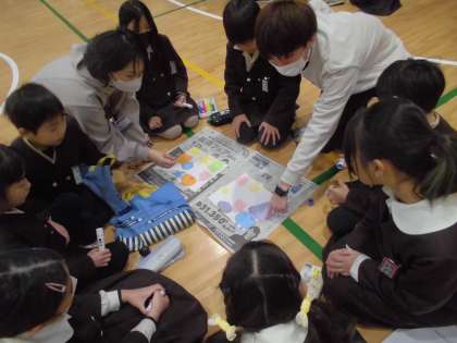 学校保健委員会の後、1時間目に「卒業お祝い集会」で6年生にわたす色紙をつくりました。前もってメッセージを書いておいたものを持ち寄って、色紙に貼るというものです。4月からリーダーとなる5年生がグループをまとめて作り上げました。