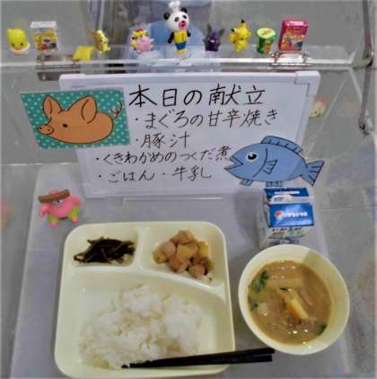 食材には、おもにエネルギーのもとになる黄色の食べ物が33種類、おもに体をつくるもとになる赤色の食べ物が8種類、おもに体の調子を整える緑色の食べ物が6種類使用されています。
