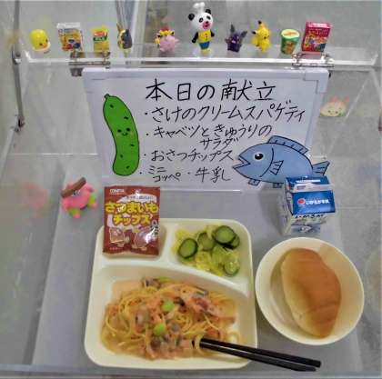 食材には、おもにエネルギーのもとになる黄色の食べ物が7種類、おもに体をつくるもとになる赤色の食べ物が3種類、おもに体の調子を整える緑色の食べ物が6種類使用されています。