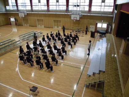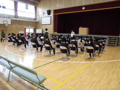 担任の先生から「式に臨む心構え」を聞き、表情も引き締まっていました。「よろこびのことば」では、心のこもった良い声が聞かれました。