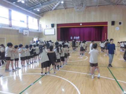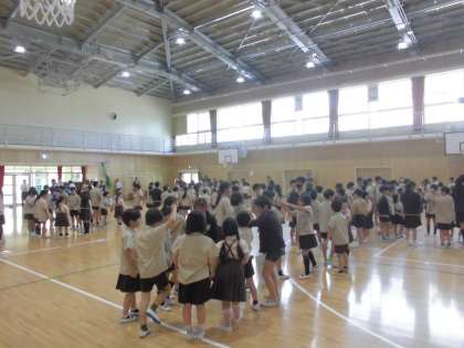 児童集会で「学校〇×クイズ」をしました。問題が出されたら、たてわり班で相談して〇か×を決めました。○は手をつないで立つ、×は一列に並びます。