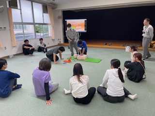 住之江消防署の方々を講師としてお招きし、教職員対象の救急救命研修会を行いました。AEDの使い方・心肺蘇生法など、6月中旬に始まるプールでの学習に備えての研修会です。