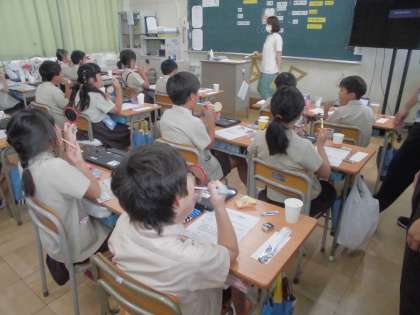 「咀嚼チェックガム」を実際に噛んでみて、噛むことの大切さを知りました。最後に、フッ化物を使って洗口をしました。「苦い〜」と言っていましたが、虫歯の予防になります。