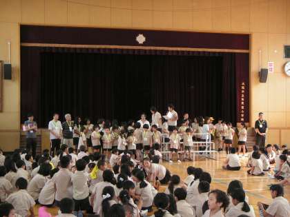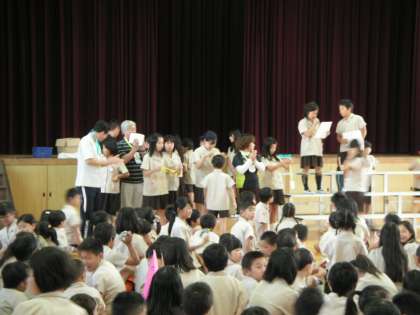 今回の児童集会は、6月のお誕生日集会とシルエットクイズをしました。今月のお誕生日集会では、先生方にも参加いただきました。また、6月8日(水)は加賀屋小学校のお誕生日(創立記念日)です。代わりに、校長先生に記念のメダルを受け取ってもらいました。「おめでとう!」と言われた時、こども達の笑顔がとても印象的でした。