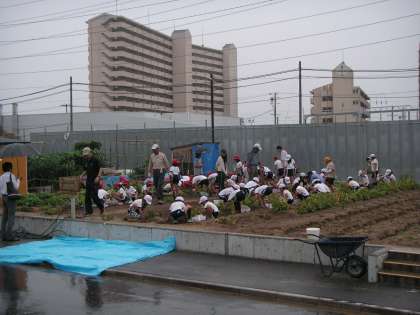 今日の空模様は昨日から、「明日の天気は大丈夫かな?」と心配でしたので、子ども達には傘を持って加賀屋農園まで行ってもらいました。