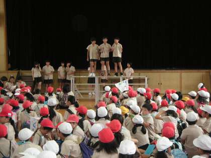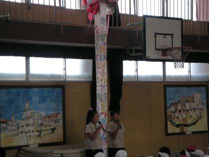 開会式では、加賀屋フェスティバルの実行委員会メンバーが活躍してくれました。準備の段階から休み時間を使って司会進行の練習をしたり、あいさつの練習をしたりと、まさに縁の下の力持ちとして頑張ってくれました。