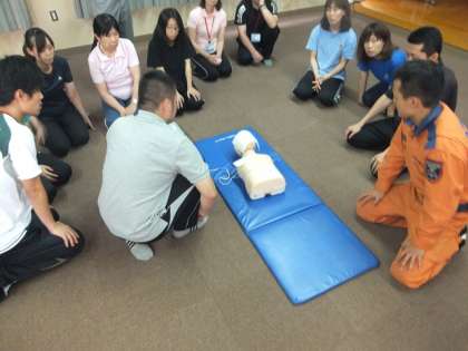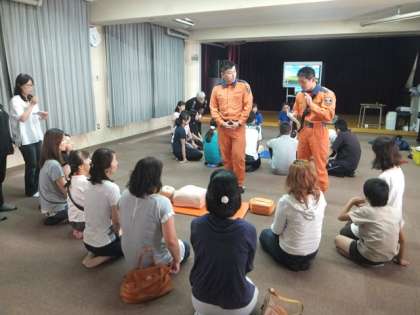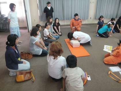 夏になると海や川・プールといった水に関わる場所での事故が毎年のように起こっています。緊急を要する場面に出会ったときでも落ち着いて対処ができるように、本校では毎年住之江消防署の救急隊の方々に来ていただき、救急救命講習会を開催しています。1・2年生の保護者の方々にも参加していただきました。