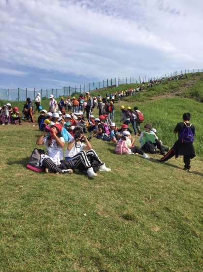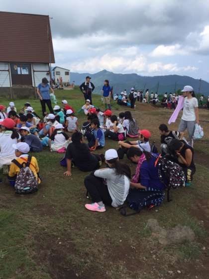 晴天のもと、みんな揃って登山開始。あまり遅れることもなく、みんなが無事、山頂に到着しました。この後、記念撮影をして下山します。