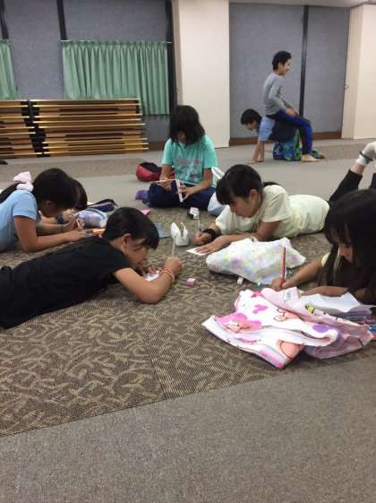 林間学習の思い出をハガキに書いています。誰のところにどんな内容のハガキが届くのでしょうね。