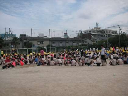9日(金)、創立100周年記念事業として、航空写真を撮影しました。加賀屋小学校のマスコットキャラクター「つきみちゃんとかがやくん」のかがやくんを運動場に描き、その周囲を子ども達が頭上に画用紙を持って立ちます。子ども達は、加賀屋小学校の上空を旋回する飛行機に大騒ぎ!(笑)飛行機が3周するまで、じっと動かずに頑張っていました。