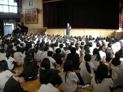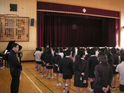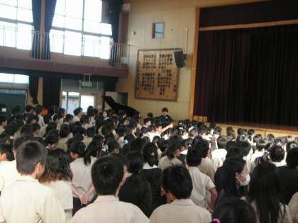 今日の児童朝会では、鳥取県で起こった地震のことに触れ、「危険を予知する能力」のことや「自分の身は自分で守る」こと、そのためにも「話はしっかり聞きましょう」ということをこどもたちと一緒に考えました。また、その後全員で「100周年の歌」を練習しました。実行委員のこどもたちが頑張ってくれたおかげで、歌声がどんどん大きくなってきました。今週の金曜日が楽しみです。