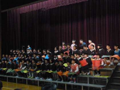 今日は、足もとが悪い中多くの方々に学校へ足を運んでいただきありがとうございました。こどもたちは本当によく頑張っていました。1年生は、舞台の上を所狭しと走り回り、2年生は抑揚をつけた歌声が特に素敵でした。3年生は、トップバッターとして緊張感が漂うなか群読とリコーダーを頑張りました。