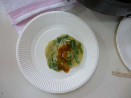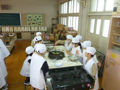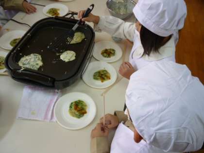 1年生がチヂミづくりに挑戦しました。ホットプレートにチヂミの生地をできるだけ薄くのばして、焼きあげていきました。はじめて、自分で作ったチヂミの味はどうだったでしょうか?たぶん、「おいしかった」ことだと思います。準備から最後のあと片付けまでを子どもたちで分担したことは、すごく良い経験になったことでしょう。
