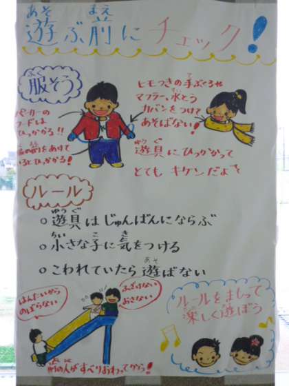 子どもたちは、休憩時間になると運動場や遊具を使って元気に遊んでいます。今年度は、加賀屋小学校にもクライムウォールという遊具が入り、きちんとルールを守って遊んでいますが、最近住之江区内の公園で、自分の服が遊具に絡まるという大変な事故が起きました。遊具を使うときには、十分注意してほしいと思います。