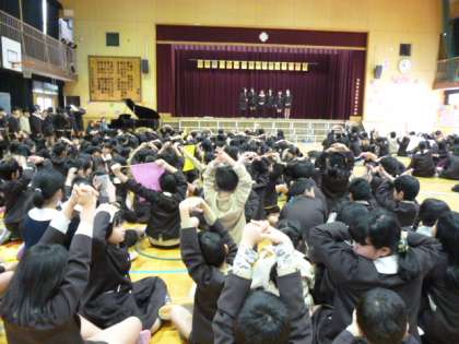 実行委員によるはじめの言葉のあと、くす玉を割り、在校生から6年生へのお祝いの言葉と歌のプレゼント。歌は6年生が組体操で使った「友よ」、『何十年先も 君を友だちって思ってる つらいときは 何でも話してよ』という一節が心に残りました。