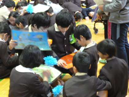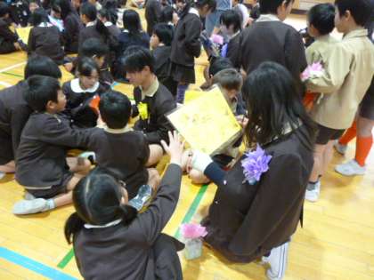 ゲームを終え、在校生が協力して作った「ペン立て」と「メッセージカード」を6年生にプレゼント。受け取った6年生は、早速メッセージに目を走らせていました。どんな素敵なメッセージが書かれていたんでしょうか。一人一人の顔を思い浮かべながら読んでくださいね。