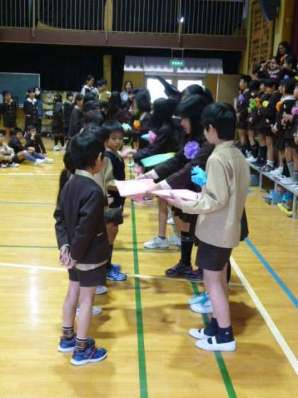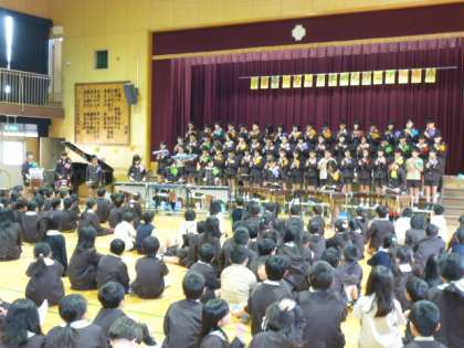 最後は6年生から在校生へのプレゼント。一つ目は「これからも学校をきれいにしてね」という思いをこめて作ったぞうきん。受け取った在校生のみなさん、大切に使って学校をきれいにしていきましょうね。二つ目は、「スターウォーズ」と「パイレーツオブカリビアン」の合奏でした。少しざわついていた在校生も合奏が始まると食い入るように見つめ、聞き入っていました。あんな風に素敵な合奏ができるようになれるといいですね。