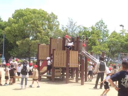 遊具のあるところに到着。他の学校の人や小さな子どもたちとゆずりあって楽しく遊んでいます。