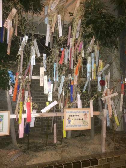 大阪市交通局加賀屋乗務所と共催で七夕飾を作りました。一人一人が短冊を書き、学年ごとの笹に飾りつけました。乗務所の方からは「子どもたちの願い事がかないますように」というメッセージも掲示していただいてます。北加賀屋駅1番出口横のガーデニングスペースに飾ってありますので、是非ご覧ください。
