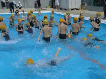 2時間目は1年生。ポニョの音楽に合わせて動く水慣れ運動もずいぶん上手になりました。ワニになったり、電車になって輪をくぐったり。宝探しも楽しみました。元気いっぱいの1年生でしたが、プールから上がった後に浴びるシャワーは水が冷たいせいか、子どもたちは「じごくのシャワー」と呼んでいます。