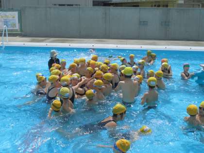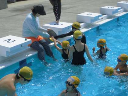昨日は、1年生が初めて大プールに入りました。安心して入ることができるように、6年生が1年生とペアになって助けてくれました。6年生の人たちにおんぶをしてもらったり、優しく声をかけてもらったりすることで、初めての大プールは、笑顔で楽しく入ることができ、大成功でした。