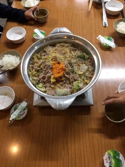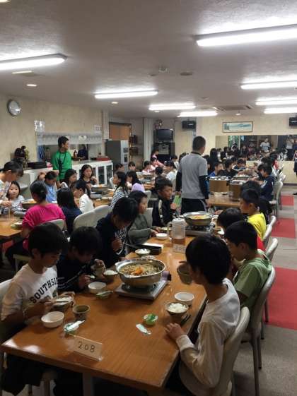 待ちに待った夕食の始まり。今夜はハチ高原名物の鴨鍋です。1日活動してお腹の空いた子どもたちにとって何よりの御馳走になると思います。