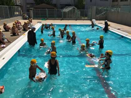 その後は、図画工作科で作った「ふね」を浮かべて遊びました。一生けんめい取り付けた部品が取れてしまったり、水が入って沈みそうになったりした船もありましたが、とても楽しそうでした。