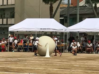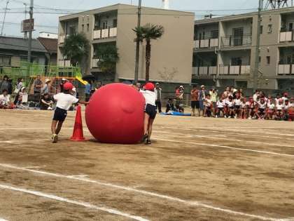 2年生の団体競技は「大玉ころがし」。二人一組になって、自分の背丈ほどもある大玉を転がします。ふわりと跳ねるので上手く転がすのがとても難しい競技です。