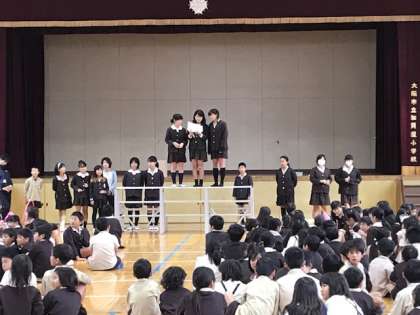 今日の集会は「先生クイズ」でした。3つのヒントをもとに、どの先生かを考えていきます。ヒントが出るたびに、子どもたちは真剣に考えていました。答えが発表されると、「あぁ、そうか」という納得や「えぇ?」という驚きの声が上がっていました。