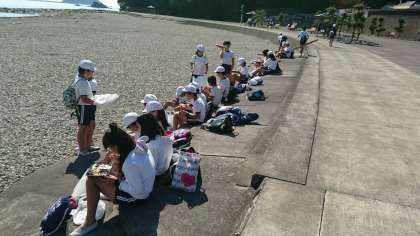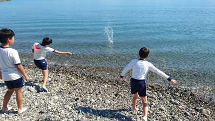 クルージングの後は、昼食。浜辺に座ってみんなそろって食べる食事はよい思い出になることと思います。食事の後は、海をながめながら一休み。思い思いにおしゃべりしたり、石で水きりをしたりして過ごしています。
