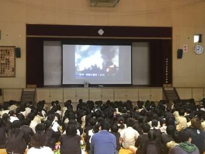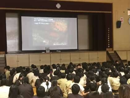 子どもたちは、講堂で地震と津波に関するビデオを鑑賞し、どのようにして被害を少なくするかについて学びました。