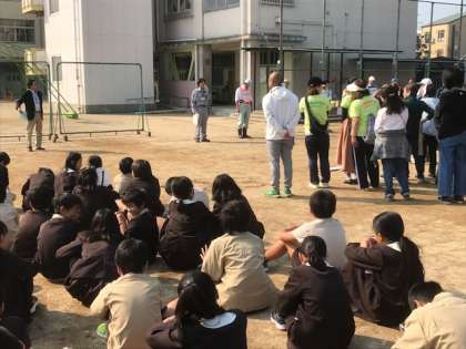 秋晴れの今日、地域・学校合同防災訓練を行いました。