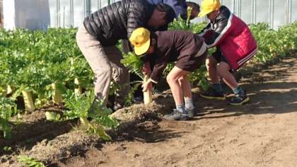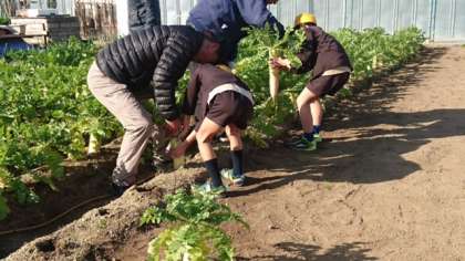 今回は4年生が加賀屋農園で大根の収穫をさせていただきました。「大きなかぶ」のお話で、引き抜くことは知っていても実際には初めてで、とても楽しみにして出かけていきました。少し顔を出しているところを引っ張ると、思っていたよりも簡単に抜けたそうです。