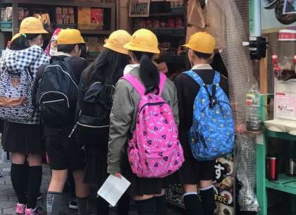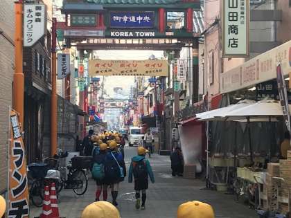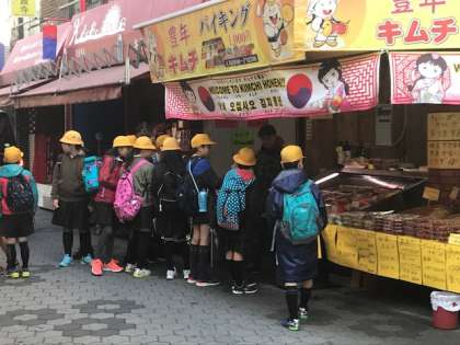 5年生が「総合的な学習」の国際理解教育の一環で、生野区にある「コリアタウン」に行ってきました。道の両側にキムチやチヂミなどの韓国食材や民族衣装を扱う店の並ぶ様子に子どもたちは興味津々で、お店の人にインタビューをしたり、買い物をしたりしました。また、その合間にはチヂミとゆず茶も味わいました。