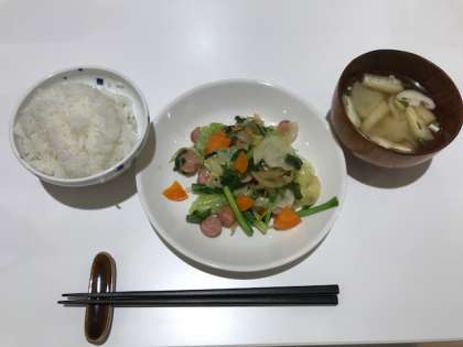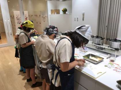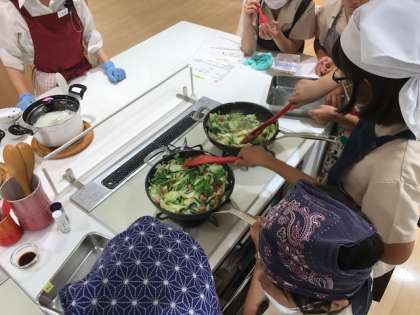 次は、調理室に場所を移して「エコ・クッキング」です。メニューはご飯・味噌汁・野菜炒め・ふりかけの4品。ご飯は、お鍋で炊きました。味噌汁は、かつお節でだしを取り、大根とうすあげ、ねぎを入れました。だしを取った後のかつお節は炒ってふりかけにしました。野菜炒めは、人参・ピーマン・玉ねぎ・ウインナーを切り、フライパンで調理、オイスターソースと塩コショウで味を整えました。どの班も協力して楽しそうに調理できました。自分たちで作った料理はおいしかったようで、日頃おかわりをしない子がおかわりをして褒められる場面も。一番人気はふりかけでした。後片付けが終わって一息ついたところで、今日の調理にかかった光熱水費や出たごみの量を班別で比べることに…。結果に一喜一憂していましたが、みんな本当によく頑張りました。この成果を林間学習でのカレー作りに生かしてくださいね。