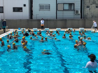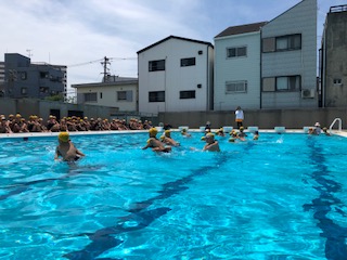 今日は、1年生が初めて大プールに入りました。