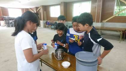 最後の行事、アイスクリーム作りです。筒の中に材料と氷を入れて、出来上がるまでひたすらころころと転がします。バニラかチョコを選んで作りました。美味しくできたそうですよ。