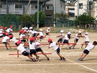 3年生の団体演技と団体競技の練習の様子です。カラフルなポンポンをテンポよく振って上手に踊っていました。