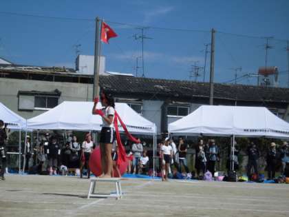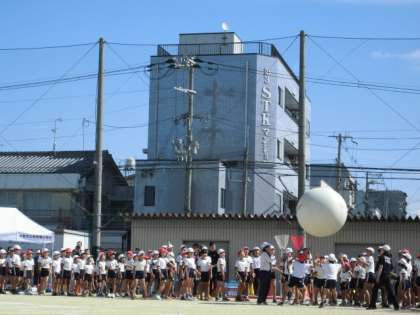 たてわり班を2つに分けて紅白の大玉を頭上で運び、競いました。