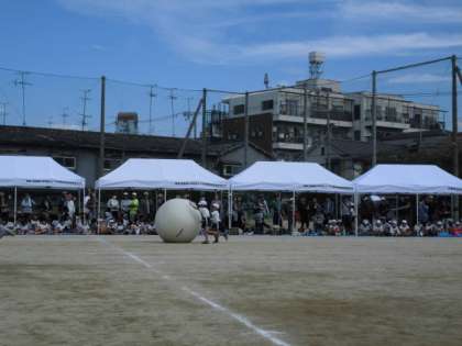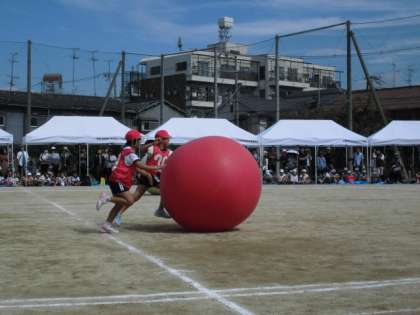 二人一組になって、自分の背丈ほどもある大玉を転がします。ふわりと跳ねるので上手く転がすのがとても難しい競技です。