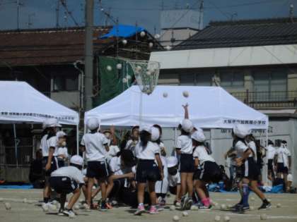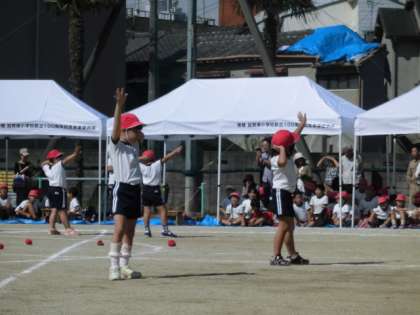 1年生の団体競技は「玉入れ」ですが、「ダンシング・ヒーロー」の曲に合わせて踊り、音楽が止まったら競技開始する少し変化のある玉入れです。