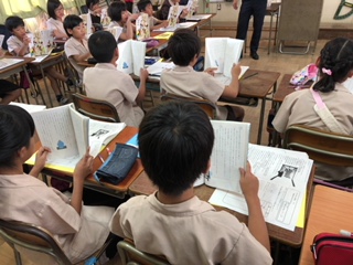 料理店の戸に書かれた言葉の意味に気をつけて、二人の紳士の気持ちの移り変わりを読み取ることを中心に進められていきました。みんな音読がとても上手で、読み取ったことを3人グループで話し合いました。3人グループで話し合ったことをもとに、全体で交流することで、さらに二人の紳士の心情について理解が深まりました。