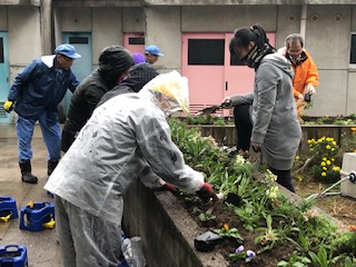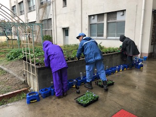 今日の委員会活動の時間に栽培美化委員会の児童、区役所の方々、地域の花さかせ隊の方々で花の苗の植え替えをする予定でしたが、雨のため児童以外の皆様で植え替えをしていただきました。