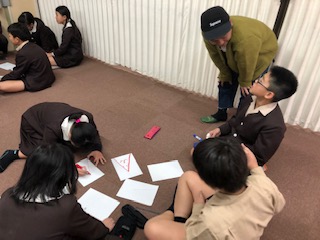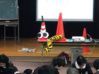 何の変哲もない赤いカラーコーンをアート作品に作り変えてしまうマサゴンさんの授業を受けた子どもたちは、グループみんなで相談しながらカラーコーンをデザインしました。