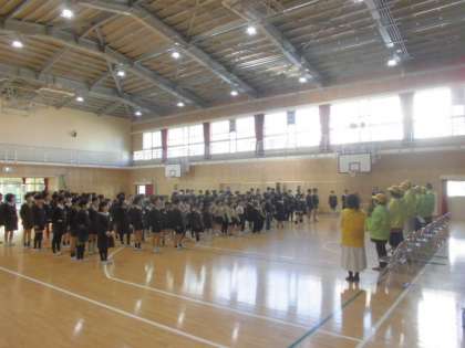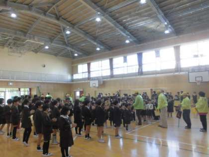 最後に校歌をうたいました。見守り隊の方は加賀屋小学校の出身の方が多く、笑顔で聴いてくださいました。これからも子どもたちの安全見守りをよろしくお願いします。