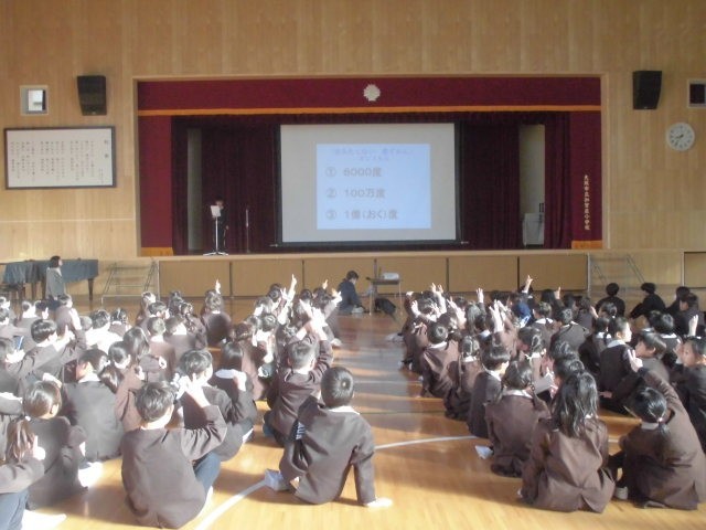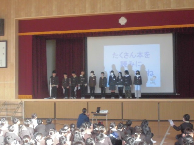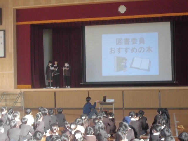 児童集会で図書委員会が発表をしました。図書クイズや本の紹介、そして図書委員会からのお願いなど盛りだくさんで、とても楽しい発表でした。また、毎週火曜日と木曜日には図書館を開放しています。この機会に、加賀屋小学校のみなさんがもっと本を読むようになってほしいです。