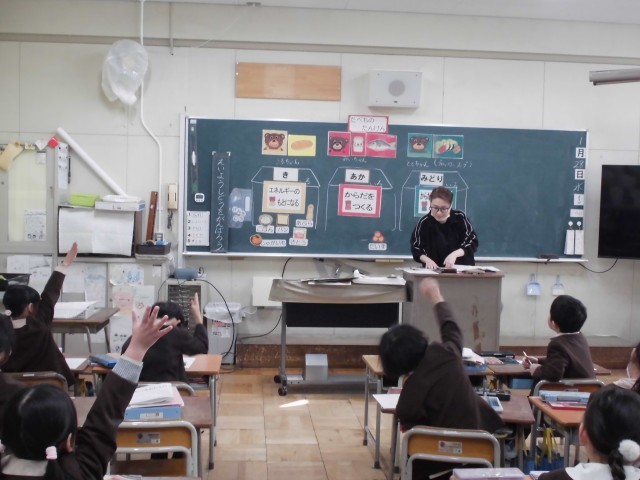 栄養士の先生が来られ、1年生と2年生が「食べもののはたらきを知ろう」について学習しました。